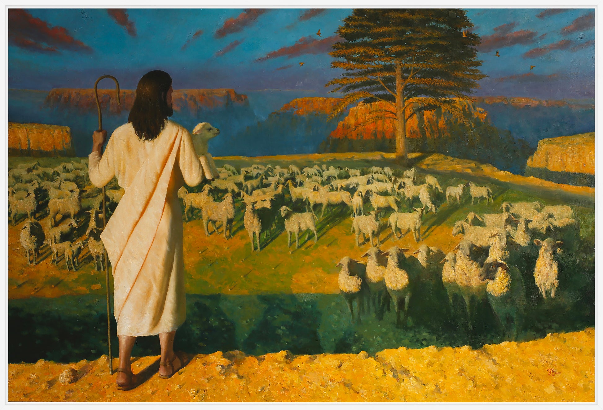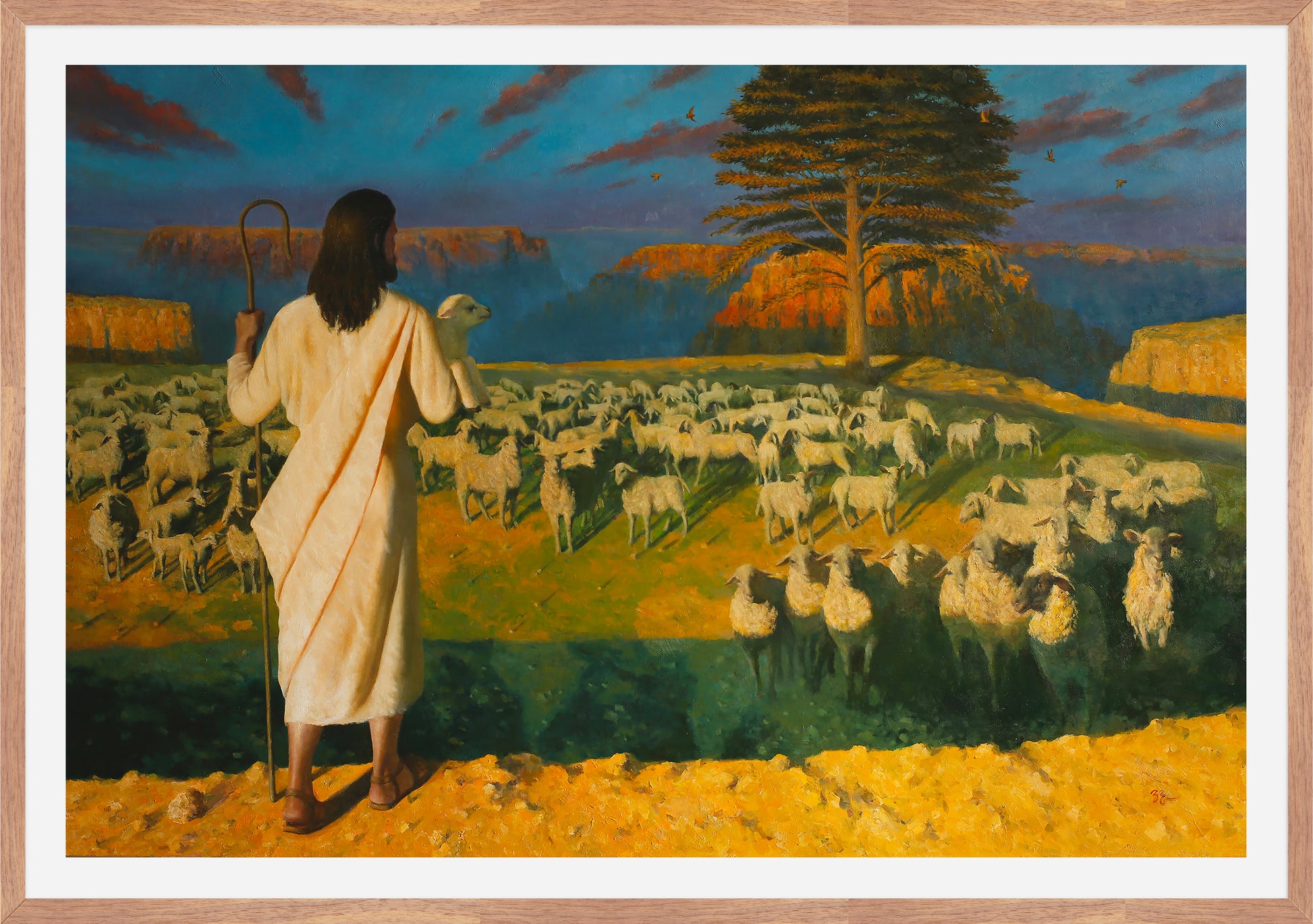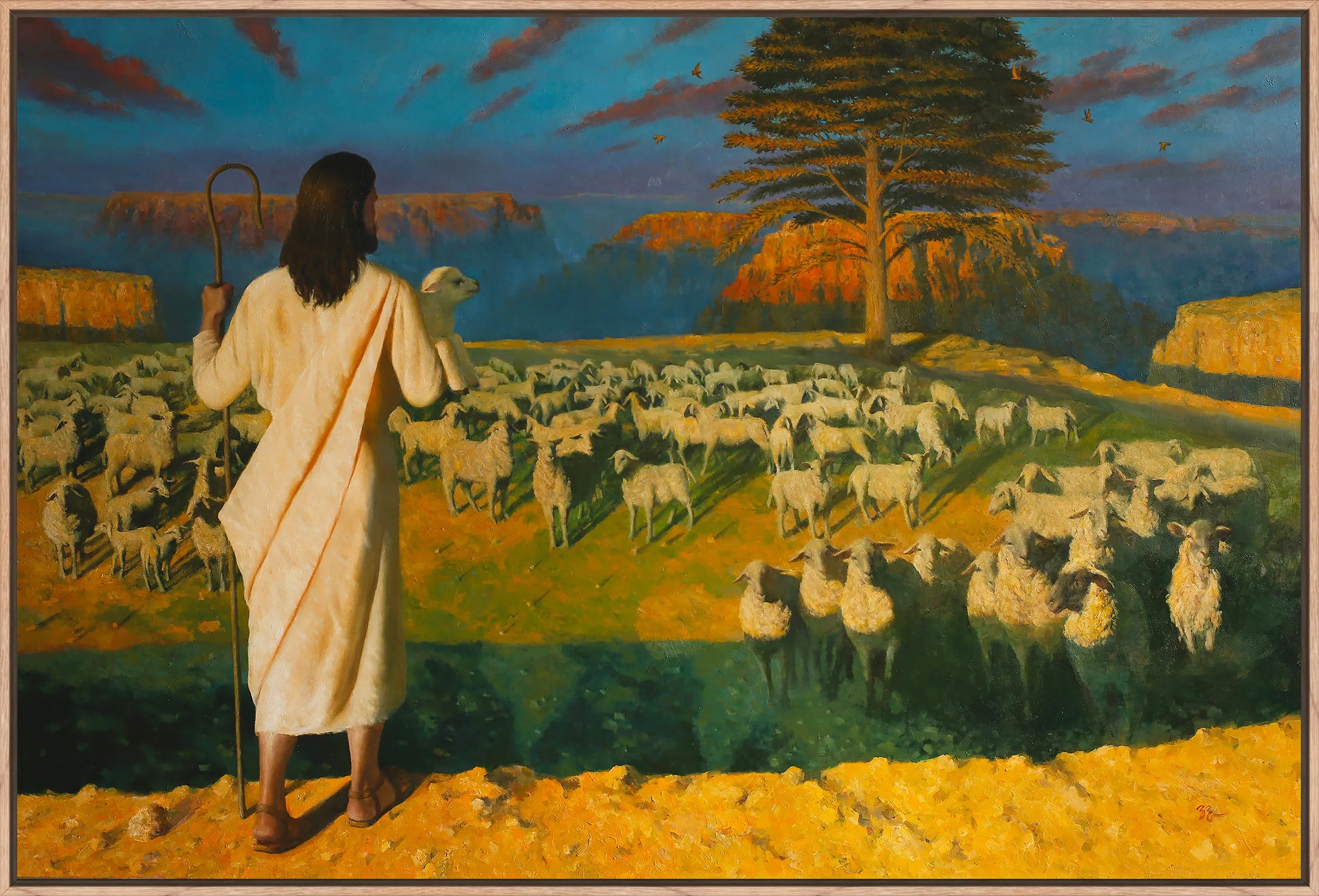 In the golden light of dawn, a lone shepherd stands at the edge of a sunlit valley, holding a rescued lamb close to his chest. The rest of the flock grazes peacefully, casting long shadows across the warm earth. But the focus is clear: one sheep, once lost, now found, resting safely in the arms of its shepherd. His gaze is steady, his staff firm — a silent testimony of tireless pursuit and unwavering love.