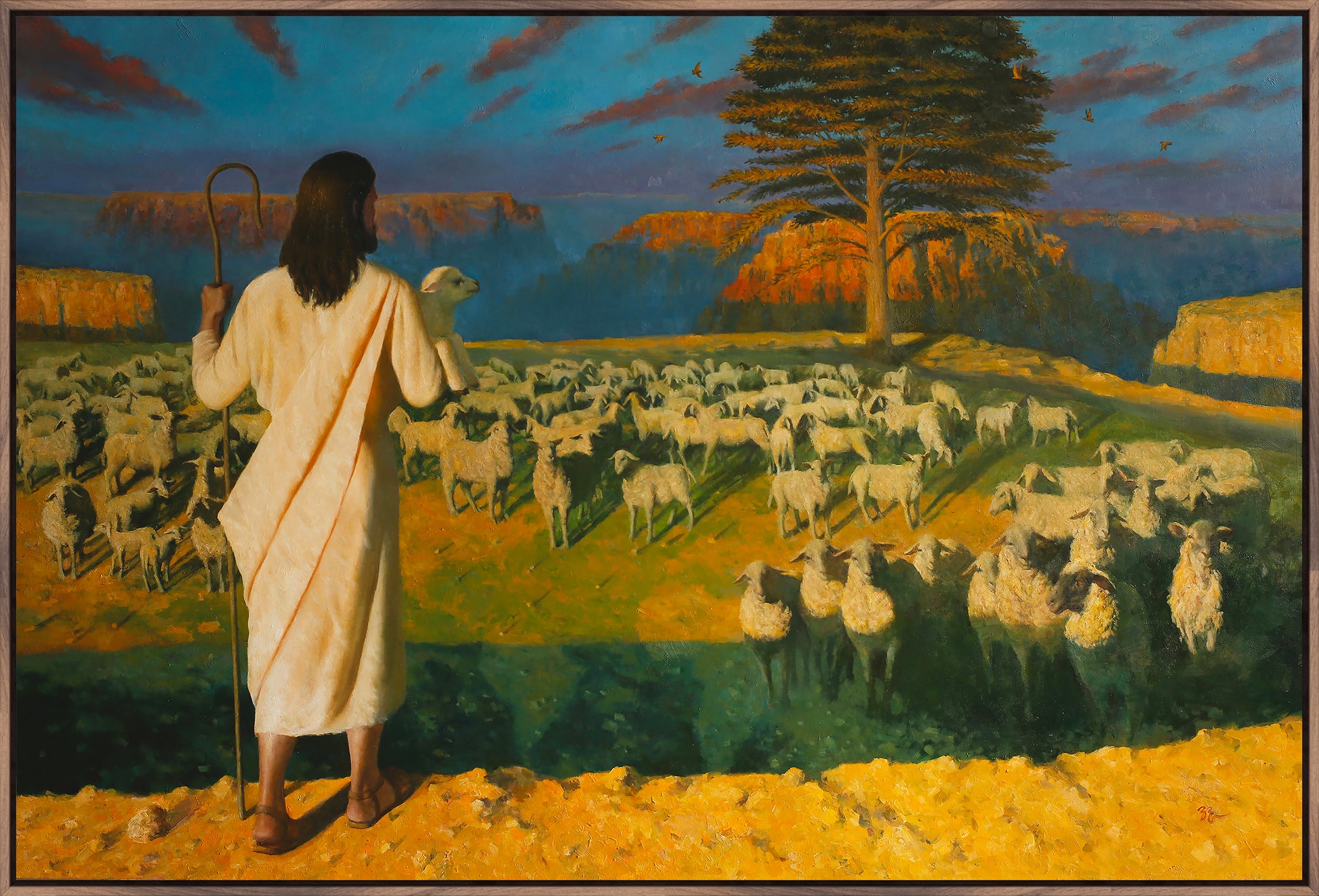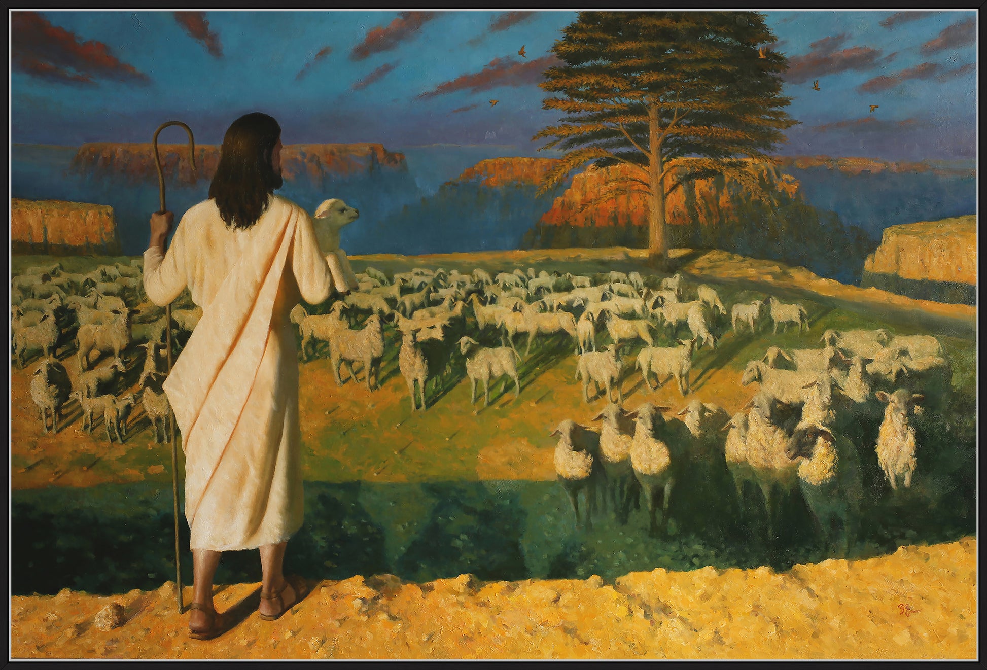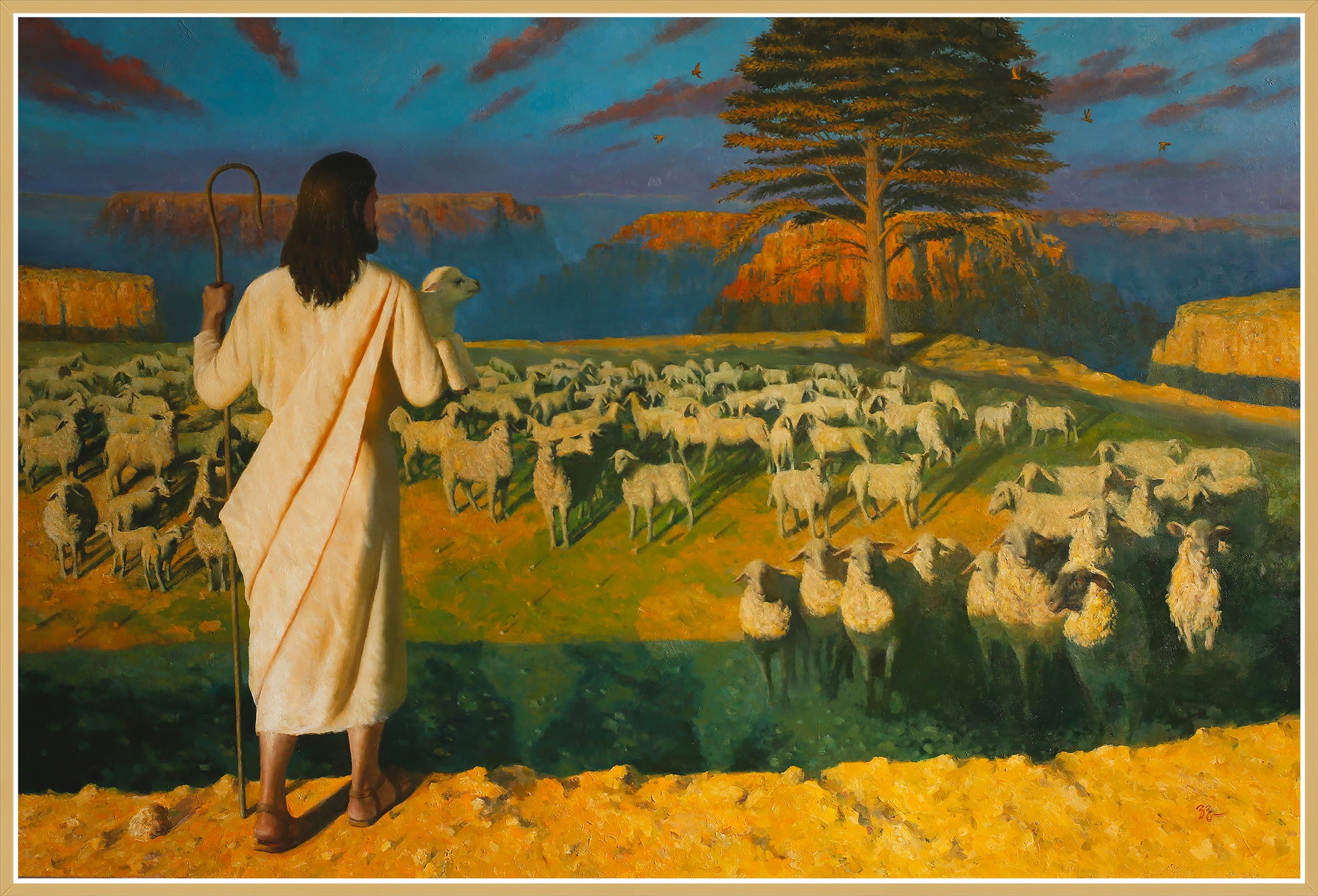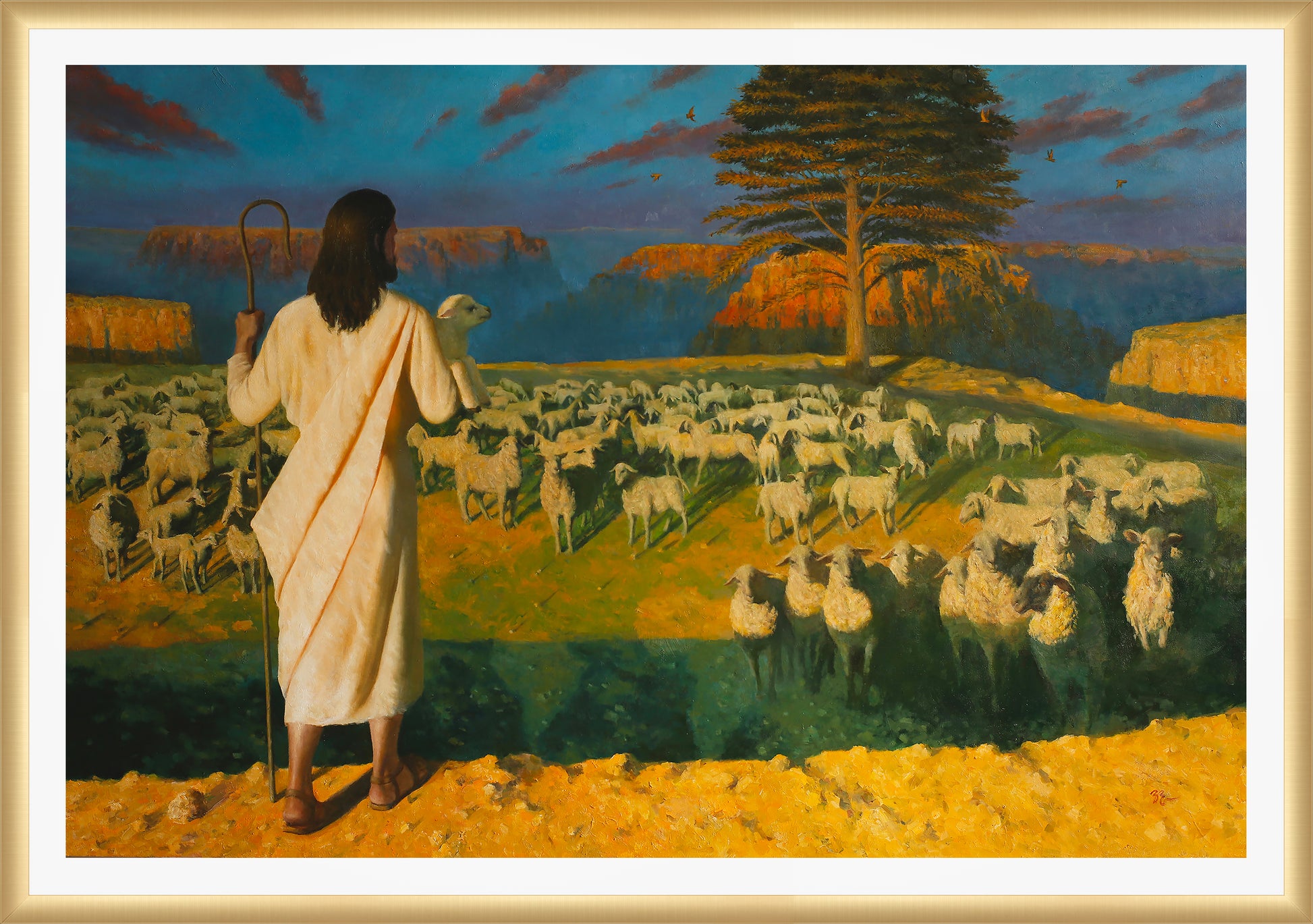 In the golden light of dawn, a lone shepherd stands at the edge of a sunlit valley, holding a rescued lamb close to his chest. The rest of the flock grazes peacefully, casting long shadows across the warm earth. But the focus is clear: one sheep, once lost, now found, resting safely in the arms of its shepherd. His gaze is steady, his staff firm — a silent testimony of tireless pursuit and unwavering love.